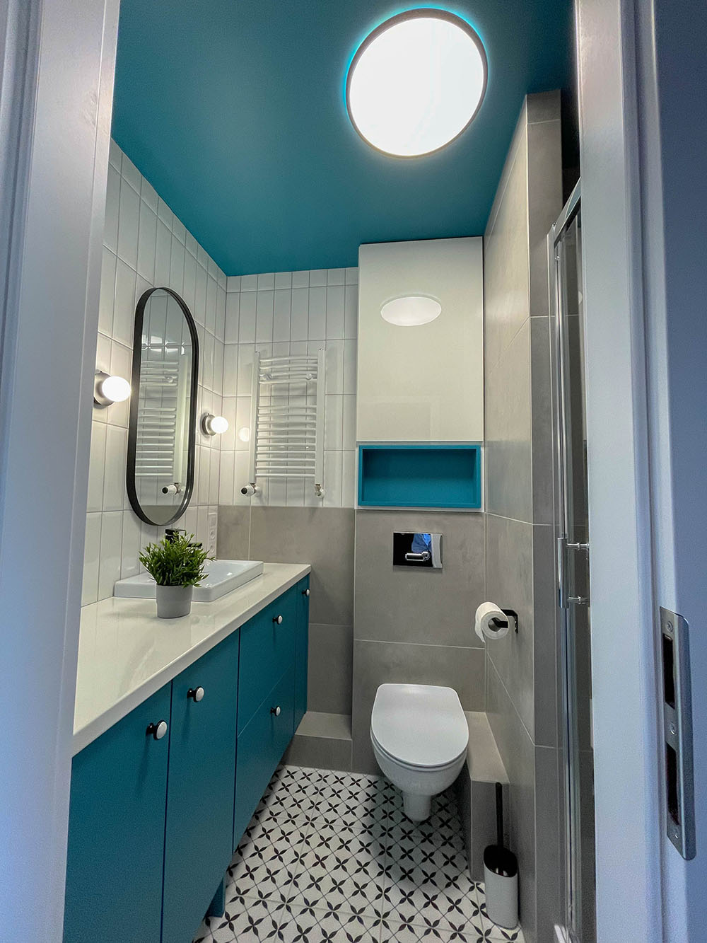 Ile my czasu poświęciliśmy na planowanie łazienki... tego nie wiedzą nawet najstarsi górale. Wycisnęliśmy 100% z każdego centymetra we współpracy ze stolarzem i projektantem wnętrz. Udało nam się wypracować tyle, ile mieści się z reguły w dwukrotnie większych łazienkach.